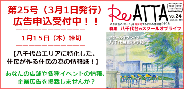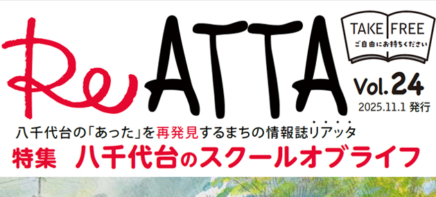 八千代台の「あった」を再発見するまちの情報誌「ReATTA」の最新号(Vol.24) が2025年11月1日に発行されました。 24号のテーマは、23号に引き続き『八千代台のスクールオブライフ』の第2...