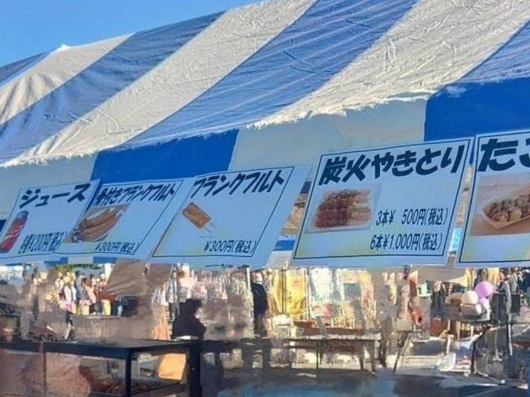 レインボーチーズハットク、しゃがバターピザ風、焼き鳥、焼きそば、オリジナルえびせんお好み焼き、超ロング30センチフランクフルト、スマイルポテト、光ボトルドリンク、ジュース類、アルコール類の販売