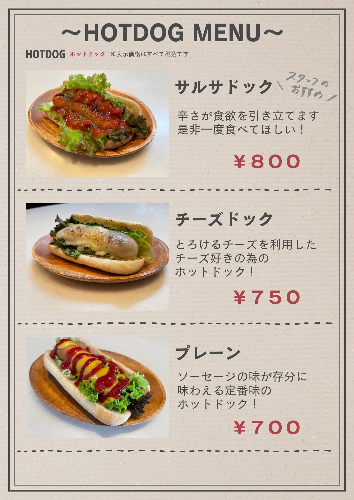 ホットドッグ、フランクフルト、骨付きフランクフルト、タン串、フライドポテト、焼きとうもろこし、ミニチュロス、ちょこばななドック、ブレンドコーヒー、カフェラテ、バナナジュース、バナナフラペチーノ、ふらのハイボール、コークハイボール、ハイボール、レモンサワー、ビール、赤、白ワイン等の販売