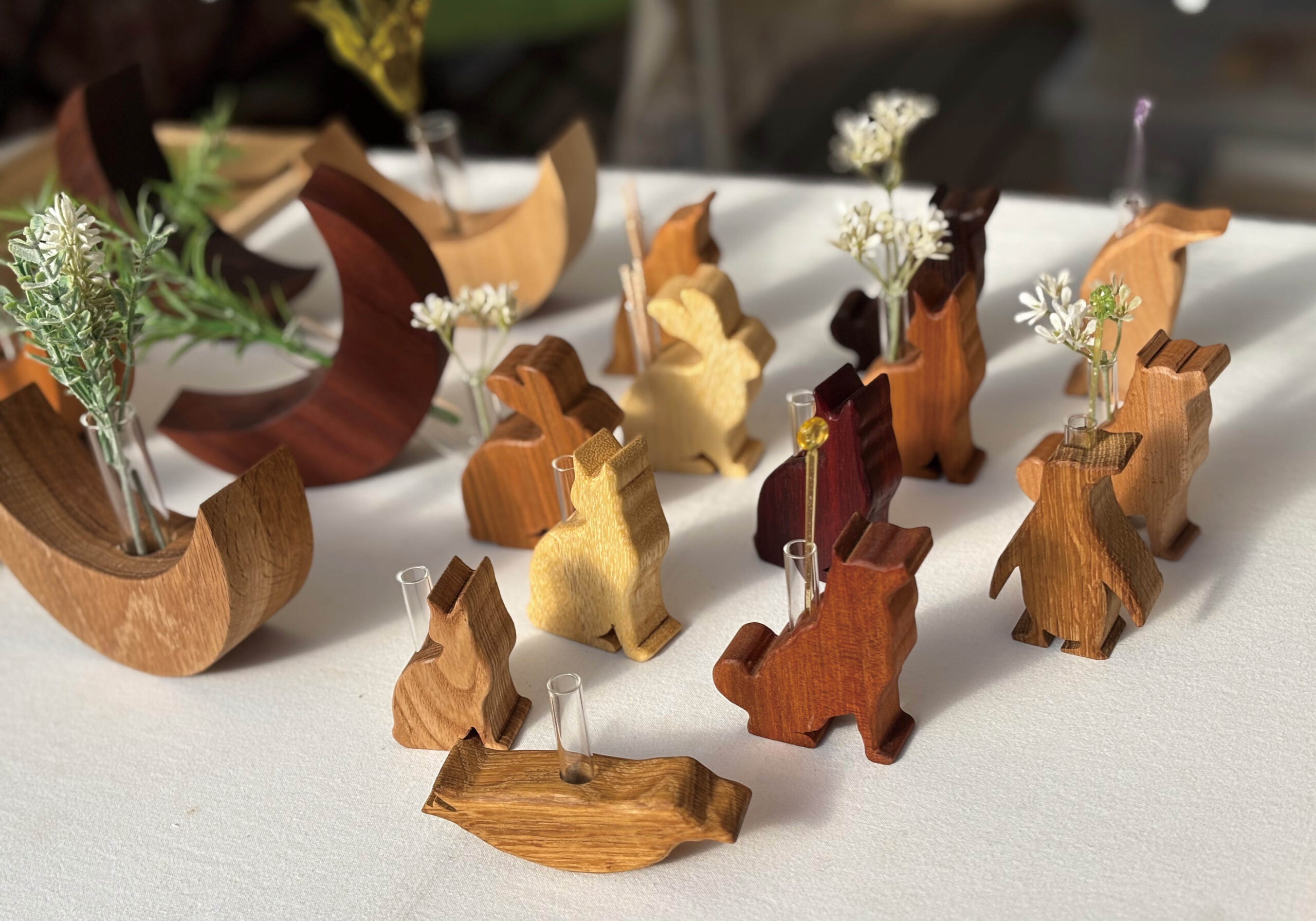 動物シルエットの黒板・鍋敷き(カッティングボード)・一輪挿し・ブローチなど、