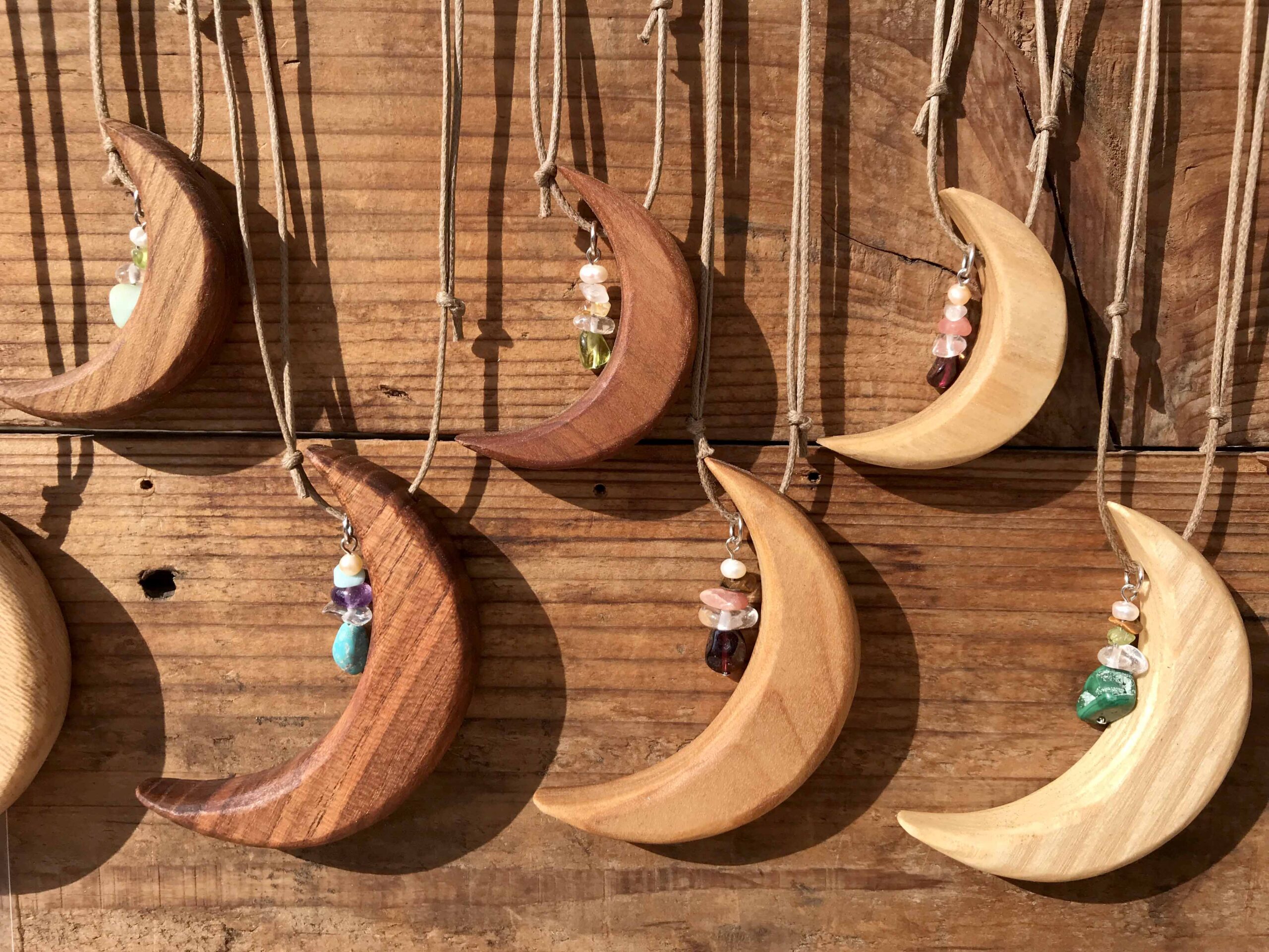 様々な種類の木のお月さまのアクセサリーなど木工作品